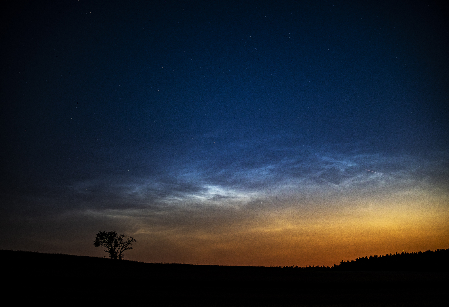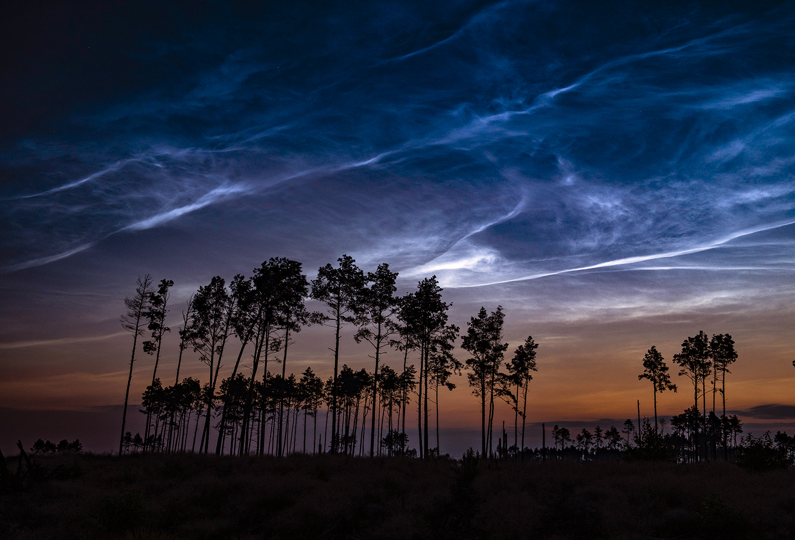 Tegoroczny sezon obłoków srebrzystych (noctilucent clouds, NLC) rozpoczął się wyjątkowo wcześnie, pierwsze obserwacje z okolic Niedźwiad zanotowaliśmy już 26 maja. Jednak przez blisko miesiąc od pierwszych doniesień, obserwowaliśmy nad Polska tylko obłoki o niewielkiej jasności położone na dodatek nisko nad horyzontem.