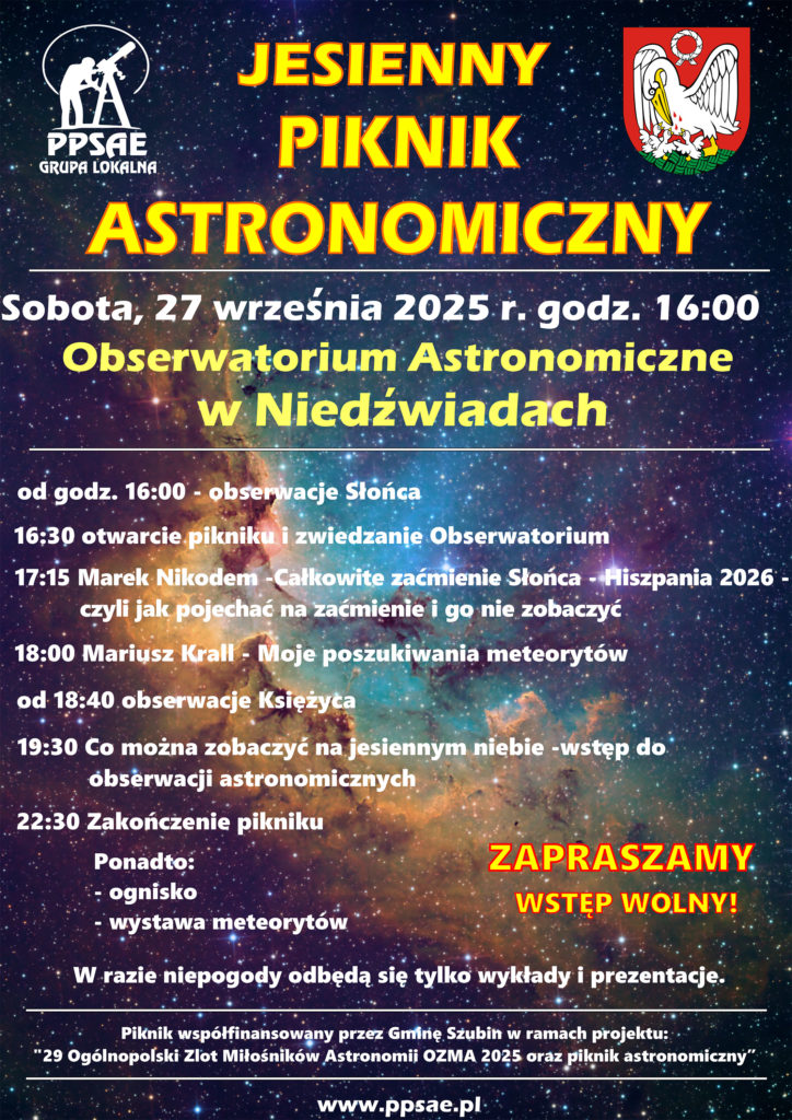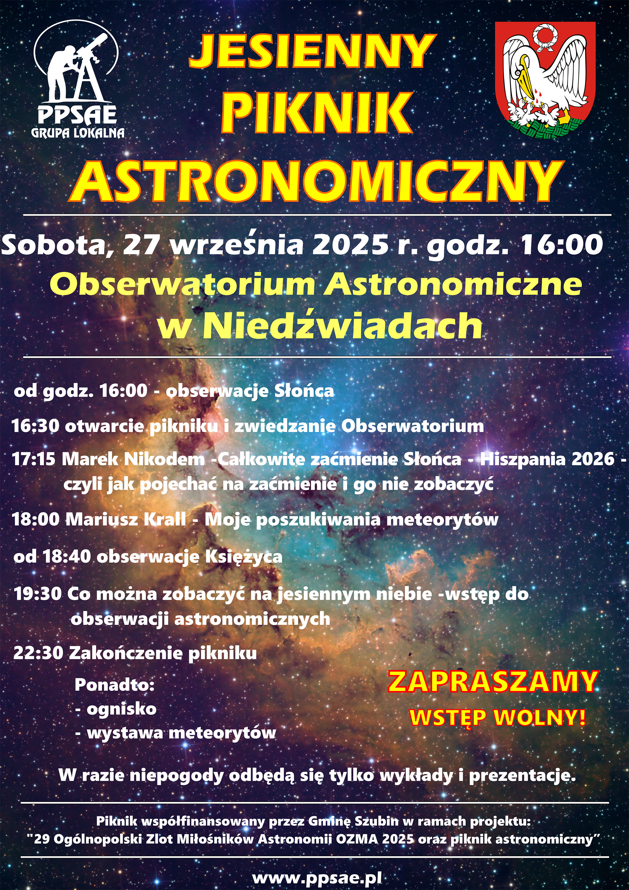 Zapraszamy wszystkich zainteresowanych do Obserwatorium Astronomicznego w Niedźwiadach na piknik astronomiczny, który odbędzie się w sobotę, 27 września 2025 roku. Piknik rozpocznie się około godz. 16 od zwiedzania Obserwatorium i obserwacji plam słonecznych i protuberancji na Słońcu. Następnie Marek Nikodem będzie zachęcał do podróży na całkowite zaćmienie Słońca w Hiszpanii w przyszłym roku. Następnie Mariusz Krall wraz ze wspomnianym już Markiem Nikodemem opowiedzą o swoich poszukiwaniach meteorytów oraz opowiedzą jak rozpoznać i skąd pochodzą te kosmiczne skarby. Proponujemy także zwiedzanie wystawy meteorytów i skamieniałości z bogatej kolekcji Stowarzyszenia. Będzie także można zobaczyć wystawę starodruków i starych czasopism i książek o tematyce astronomicznej. Jeżeli niebo będzie bezchmurne przystąpimy do obserwacji astronomicznych przez teleskopy będące na wyposażeniu naszego obserwatorium. Zaczniemy od podziwiania Księżyca, następnie teleskopy nakierujemy na obiekty głębokiego nieba, czyli m.in. na galaktyki, mgławice i gromady gwiazd. W przeciwnym wypadku zamiast obserwacji zostanie wyświetlona prezentacja multimedialna. Piknik jest współfinansowany przez Gminę Szubin w ramach projektu „29 OZMA”. Podczas pikniku czynne będzie ognisko. Przypominamy o ciepłym ubiorze. W przypadku zachmurzonego nieba piknik zakończy się około godz. 20.00 . Wstęp darmowy. Zapraszamy!