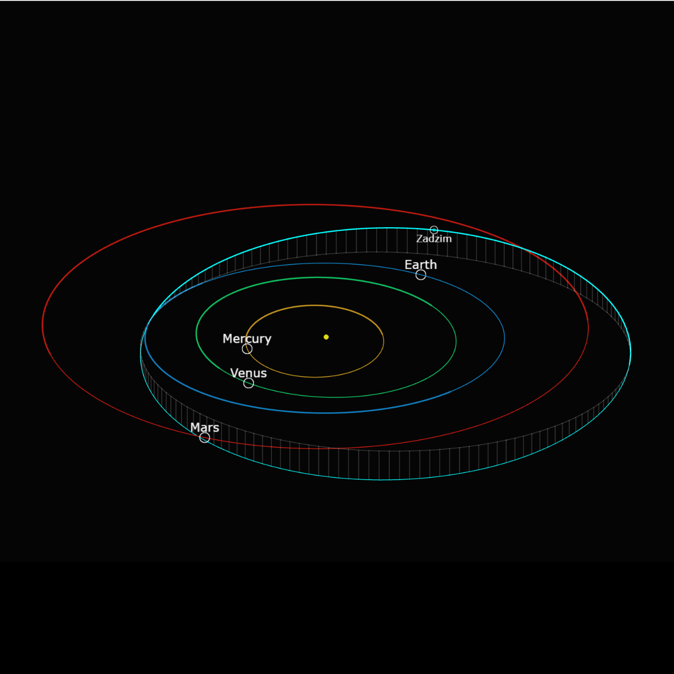 Orbita meteoroidu (turkusowa linia) względem planet wewnętrznych Układu Słonecznego / oprac. Mateusz Żmija