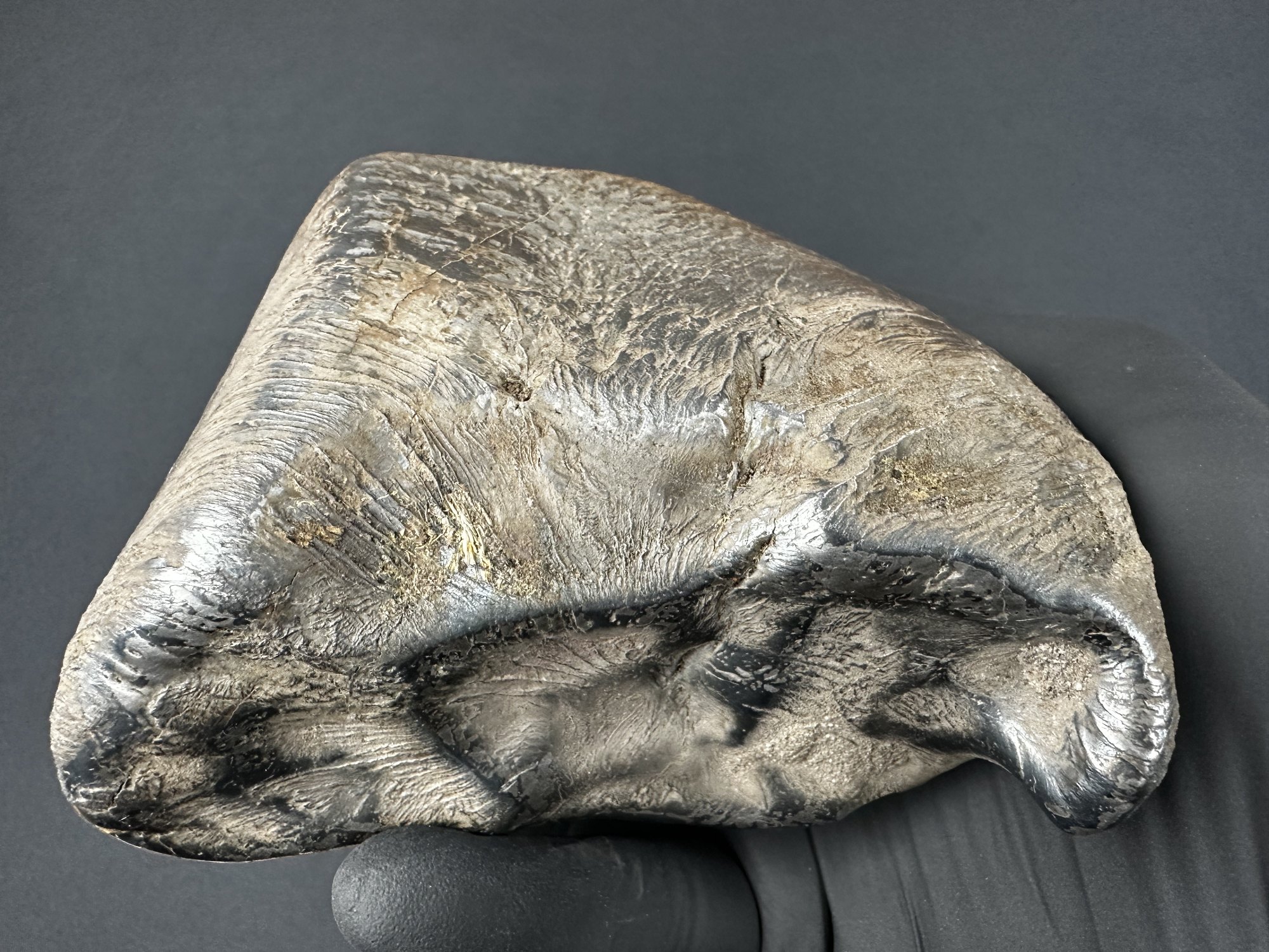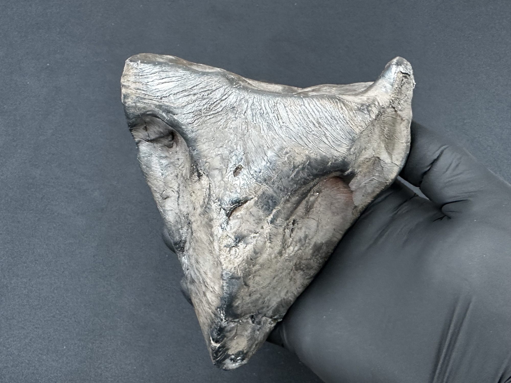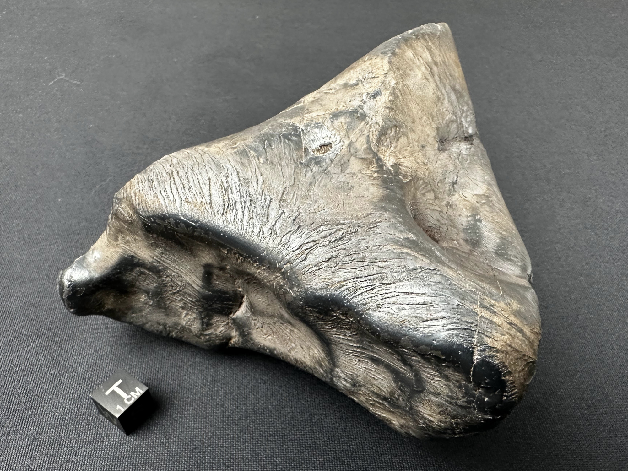 Okaz po oczyszczeniu z ziemi – widoczne liczne linie spływu biegnące od czoła meteorytu w kierunku tylnej, lekko spiczastej części, fot. Szymon Kozłowski