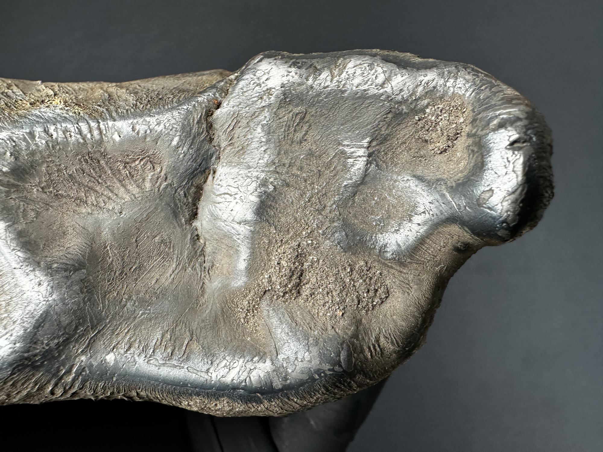 Zbliżenie prezentujące zastygłe strużki żelaza na powierzchni meteorytu