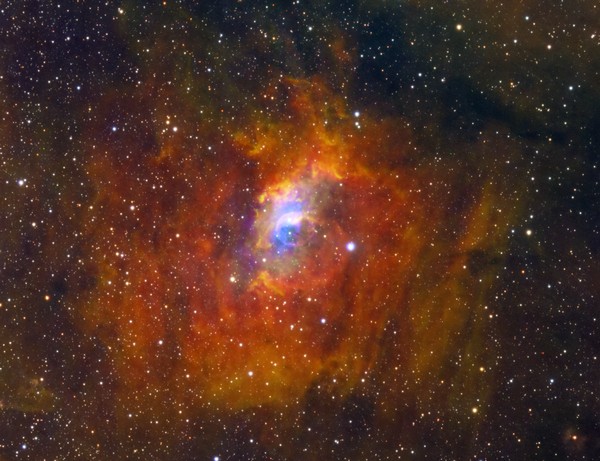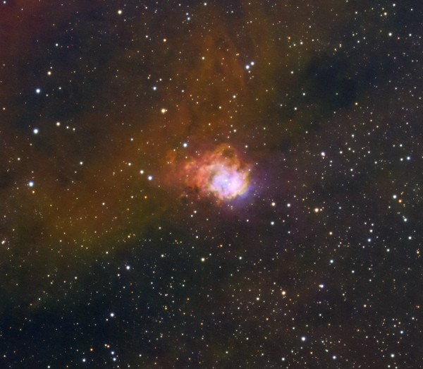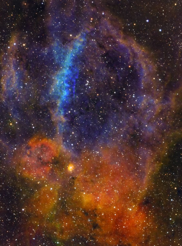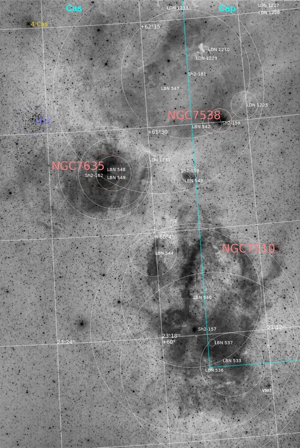 Na granicy gwiazdozbiorów Kasjopei i Cefeusza znajduje się obszar zawierający bardzo ciekawe obiekty. Zastosowanie krótkiego refraktora EDF 76 mm o ogniskowej 324 mm zawieszonego na teleskopie BAJ, pozwoliło sfotografować je w jednym kadrze. Zdjęcie powstało ze złożenia obrazów uzyskanych kamerą ASI 294 mm przez filtry wąskopasmowe Ha, OIII, SII oraz szerokopasmowe RGB w dn. 19-20 września 2025. Łączny czas ekspozycji wynosił 4 godziny 58 minut.