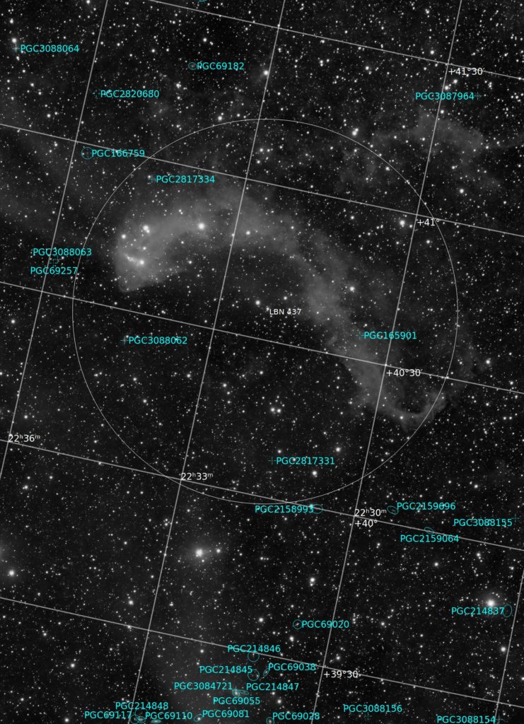 W południowej części gwiazdozbioru Jaszczurki, około 2 stopni poniżej gwiazdy 6 Lac o jasności 4,5 magnitudo, znajduje się mgławica LBN 437 „Gekon”. Numer katalogowy LBN 437 odnosi się do centralnej ciemnej mgławicy. Znajduje się ona w środku znacznie większego obszaru HII Sharpless 126. Ciemna mgławica wykazuje czerwonawy blask wodorowy na krawędziach. Wierzchołek mgławicy wskazuje dokładnie w kierunku źródła jonizacji, gwiazdy 10 Lacertae, która znajduje się poza kadrem.
