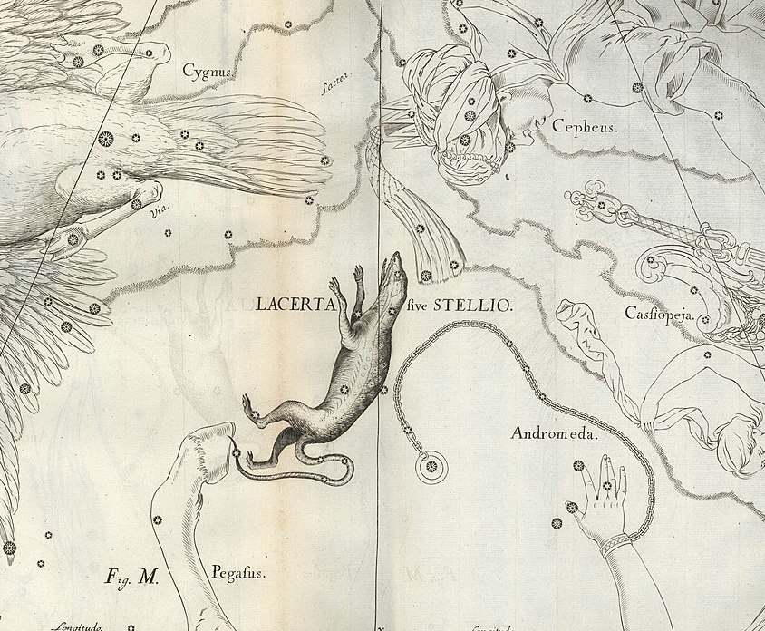Lacerta (Jaszczurka) to niewielki i niepozorny gwiazdozbiór wciśnięty miedzy Andromedą i Łabędziem. Wyznaczony przez Jana Heweliusza około 1687 roku i opublikowany w 1690 roku w atlasie „Firmamentum Sobiescianum”* Na niebie zajmuje powierzchnię 201 stopni kwadratowych, najjaśniejsza gwiazda gwiazdozbioru o jasności 3,77 magnitudo jest gwiazdą podwójną** pozostałe mają jasność nie więcej niż 4 magnitudo przez co, żadna nie posiada nazwy własnej a jedynie oznaczenia liczbowo literowe.
